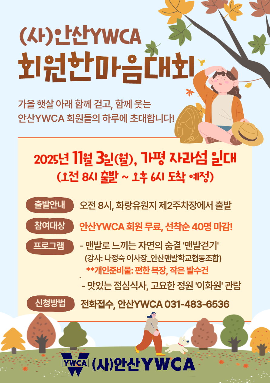 제목 안산YWCA 회원한마음대회(무료) '가평 자라섬 함께 가요!'